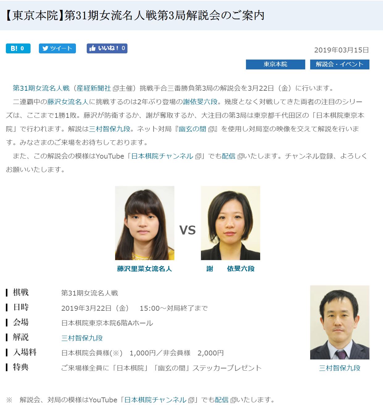藤沢里菜女流名人に謝依旻六段が挑戦する女流名人戦三番勝負は、互いに1勝1敗となり3月22日(金)に行われる第3局が大注目となっている。